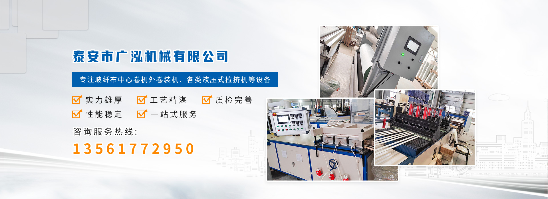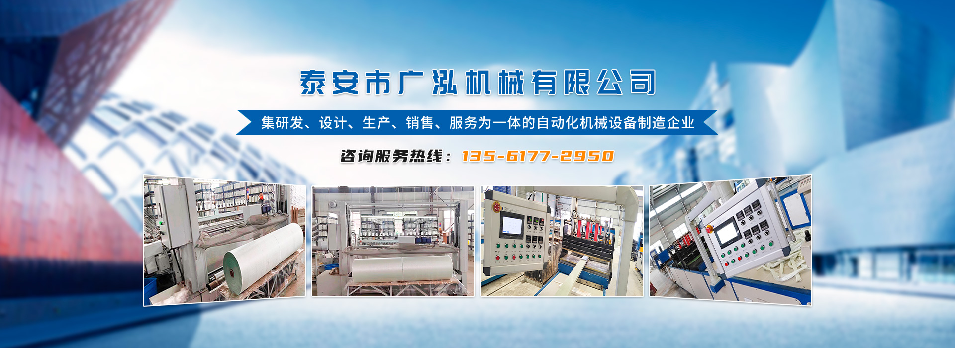 泰安市廣泓機(jī)械有限公司,是一家集研發(fā)、設(shè)計(jì)、生產(chǎn)、銷售、服務(wù)為一體的自動化機(jī)械設(shè)備制造企業(yè)。公司擁有一支由業(yè)內(nèi)精英技術(shù)人士組成的研發(fā)隊(duì)伍,采用精湛生產(chǎn)工藝,致力為用戶提供自動化智能化的產(chǎn)品。經(jīng)過多年來的發(fā)展及客戶的支持,公司現(xiàn)已研發(fā)了多種成熟設(shè)備推出市場,主要產(chǎn)品包含:玻纖布中心卷機(jī)外卷裝機(jī)、各類液壓式拉擠設(shè)備等產(chǎn)品,受到客戶的一致好評。公司不斷強(qiáng)化服務(wù)。堅(jiān)持以質(zhì)取勝、以誠取信的原則為廣大新老用戶提供更好、更滿意的產(chǎn)品。竭誠與新老客戶、各界朋友攜手合作,共創(chuàng)偉業(yè)!